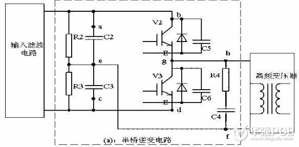 2.高頻逆變電路的電磁兼容設(shè)計,如圖所示,C2、C3、V2、V3組成的半橋逆變電路,V2、V3為IGBT、MOSFET等開關(guān)元件,在V2、V3開通和關(guān)斷時,由于開關(guān)時間很快以及引線電感、變壓器漏感的存在,回路會產(chǎn)生較高的di/dt、dv/dt突變,從而形成電磁干擾,為此在變壓器原邊兩端增加R4、C4構(gòu)成的吸收回路,或在V2、V3兩端分別并聯(lián)電容器C5、C6,并縮短引線,減小ab、cd、gh、ef的引線電感。在設(shè)計中,C4、C5、C6一般采用低感電容,電容器容量的大小取決于引線電感量、回路中電流值以及允許的過沖電壓值的大小,LI2/2=C△V2/2公式求得C的大小,其中L為回路電感,I為回路電流,△V為過沖電壓值。