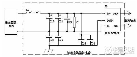 輸出直流濾波電路主要用于切斷電磁傳導(dǎo)干擾沿導(dǎo)線向輸出負(fù)載端傳播,減小電磁干擾在導(dǎo)線周圍的電磁輻射。