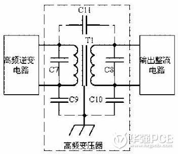 如圖所示,C7、C8為匝間耦合電路,C11為繞組間耦合電容,在變壓器繞制時,盡量減小分布電容C11,以減小變壓器原邊的高頻干擾耦合到次邊繞組。另外為進一步減小電磁干擾,可在原、次邊繞組間增加一個屏蔽層,屏蔽層良好接地,這樣變壓器原、次邊繞組對屏蔽層間就形成耦合電容C9、C10,高頻干擾電流就通過C9、C10流到大地。