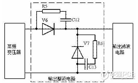 如圖所示為輸出半波整流電路,V6為整流二極管,V7為續(xù)流二極管,由于V6、V7工作于高頻開關(guān)狀態(tài),因此輸出整流電路的電磁干擾源主要是V6和V7,R5、C12和R6、C13分別連接成V6、V7的吸收電路,用于吸收其開關(guān)動作時產(chǎn)生的電壓尖峰,并以熱的形式在R5、R6上消耗。