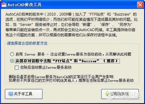 AutoCAD修改工具是一款可以幫助你解決AutoCAD出現(xiàn)的問題。AutoCAD后來的版本中加入了“FTP站點(diǎn)”和“Buzzsaw”的選項(xiàng),在我們平時用得極少,而他們卻可能在某些情況下造成莫名其妙的問題。比如,當(dāng)“Server”服務(wù)被停止時,它們會導(dǎo)致“新建”、“保存”、“另存為”等菜單只能在安裝后點(diǎn)一次,再點(diǎn)即會立刻讓AutoCAD死掉。