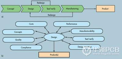 圖1:(a) 傳統(tǒng)PCB串行開發(fā)流程的設(shè)計周期長,信息共享有限,而成本持續(xù)上升;