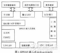 由圖1可見(jiàn).系統(tǒng)以微處理器EP9315為核心,具有完備的外設(shè)接口功能,同時(shí)控制工程檢測(cè)儀。IDE/CF卡接口為工程檢測(cè)數(shù)據(jù)提供大容量移動(dòng)存儲(chǔ)設(shè)備;擴(kuò)展32M的SDRAM作為外部數(shù)據(jù)存儲(chǔ)空間;3個(gè)主動(dòng)USB接口支持USB鍵盤鼠標(biāo);LCD接口支持STN/TFT液晶和觸摸屏.為用戶提供友好的交互界面;1/10/100 Mbps以太網(wǎng)為調(diào)試操作系統(tǒng)時(shí)下載內(nèi)核及工程檢測(cè)時(shí)遠(yuǎn)程監(jiān)控提供途徑;面板按鍵為工程人員野外作業(yè)無(wú)法使用鍵盤鼠標(biāo)時(shí)提供人機(jī)交互接口。