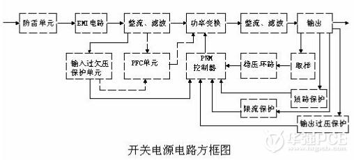 開關(guān)電源的主要電路是由輸入電磁干擾濾波器(EMI)、整流濾波電路、功率變換電路、PWM控制器電路、輸出整流濾波電路組成。輔助電路有輸入過欠壓保護(hù)電路、輸出過欠壓保護(hù)電路、輸出過流保護(hù)電路、輸出短路保護(hù)電路等。