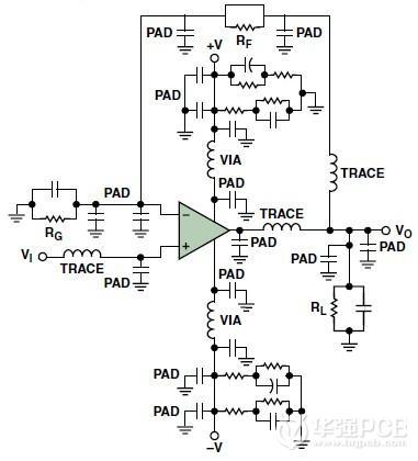 所謂寄生效應(yīng)就是那些溜進(jìn)你的PCB并在電路中大施破壞、頭痛令人、原因不明的小故障(按照字面意思)。它們就是滲入高速電路中隱藏的寄生電容和寄生電感。 其中包括由封裝引腳和印制線過長形成的寄生電感;焊盤到地、焊盤到電源平面和焊盤到印制線之間形成的寄生電容;通孔之間的相互影響,以及許多其它可能的寄 生效應(yīng)。圖3(a)示出了一個典型的同相運算放大器原理圖。但是,如果考慮寄生效應(yīng)的話,同樣的電路可能會變成圖3(b)那樣。