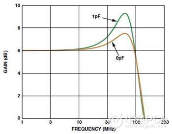 在高速電路中,很小的值就會影響電路的性能。有時候幾十個皮法(pF)的電容就足夠了。相關(guān)實例:如果在反相輸入端僅有1 pF的附加寄生電容,它在頻率域可以引起差不多2 dB的尖脈沖(見圖4)。如果寄生電容足夠大的話,它會引起電路的不穩(wěn)定和振蕩。