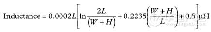 帶狀電感是另外一種需要考慮的寄生效應(yīng),它是由于印制線過長或缺乏接地平面引起的。式(2)示出了計算印制線電感(Inductance)的公式。參見圖6。
