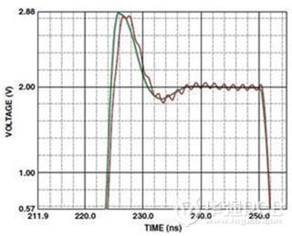 圖7中的振蕩示出了高速運算放大器同相輸入端長度為2.54 cm的印制線的影響。其等效寄生電感為29 nH(10-9H),足以造成持續(xù)的低壓振蕩,會持續(xù)到整個瞬態(tài)響應(yīng)周期。圖7還示出了如何利用接地平面來減小寄生電感的影響。