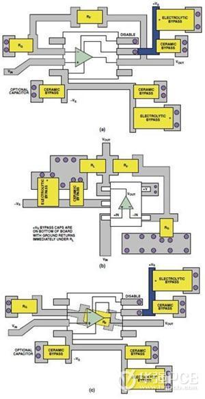 圖9. 同一運算放大器電路的布線區(qū)別。(a)SOIC封裝,(b)SOT-23封裝,(c)在PCB下面采用RF的SOIC封裝。