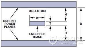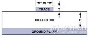 H表示從接地平面到信號印制線之間的距離,W表示印制線寬度,T表示印制線厚度;全部尺寸均以密耳(mils)(10-3英寸)為單位。εr表示PCB材料的介電常數(shù)。