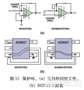 保護(hù)環(huán),或者說“隔離環(huán)”,是運算放大器常用的另一種屏蔽方法,它用于防止寄生電流進(jìn)入敏感結(jié)點。其基本原理很簡單——用一條保護(hù)導(dǎo)線將敏感結(jié)點完全包圍起 來,導(dǎo)線保持或者迫使它保持(低阻抗)與敏感結(jié)點相同的電勢,因此使吸收的寄生電流遠(yuǎn)離了敏感結(jié)點。圖15(a)示出了用于運算放大器反相配置和同相配置 中的保護(hù)環(huán)的原理圖。圖15(b)示出用于SOT-23-5封裝中兩種保護(hù)環(huán)的典型布線方法。