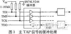 為保證信號(hào)的完整性,本文對(duì)來自測(cè)試裝置的主TAP控制信號(hào)進(jìn)行了緩沖處理,同時(shí)用上拉電阻將TDI、TMS信號(hào)拉至邏輯1狀態(tài),將TCK下拉接地。另外,在最后一個(gè)器件的TDO和被測(cè)板的TDO端口之間放置一個(gè)20 Ω的電阻以衰減反射。緩沖器類型的選用要參考電路板上器件的電平類型。如圖3所示,被測(cè)板上邊界掃描器件工作電壓為3.3 V,本文選用的緩沖器SN74LV244的工作電壓為2.7 V~5.5 V,可以滿足需要。