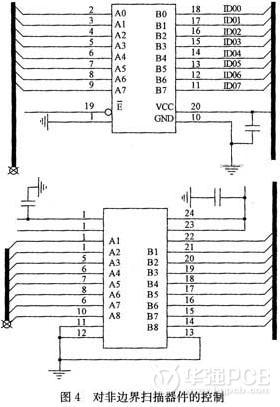 為了增加可控制性,對(duì)于非邊界掃描器件的重要的控制信號(hào),如片選端和使能端,盡可能地直接控制,或者通過邊界掃描器件的邊界掃描單元進(jìn)行控制。這樣在測(cè)試時(shí),為了避免信號(hào)沖突可以把相應(yīng)的器件禁用或者改變信號(hào)輸入輸出的方向。如圖4所示,器件N17(SN74LVC4245A)的/OE端和DIR端與N14(EPLD)的引腳相連。N50(74F245)的/E端也受N14控制,而DIR端接地,N50的/E端選通時(shí),固定的B端為輸入而A端為輸出。N17和N50的A端引腳共享VXI總線的D00-D07,但B端引腳分別連在不同的總線上。如果N17的/OE端選通,DIR端置0時(shí),A端為輸入,與N50的A端為輸出相矛盾;DIR端置1時(shí),B端為輸入,不同的總線信號(hào)發(fā)送到同一引腳上,引起沖突。因此,通過N14的BS引腳控制N17和N50,讓兩個(gè)器件不同時(shí)選通,使測(cè)試順利進(jìn)行。