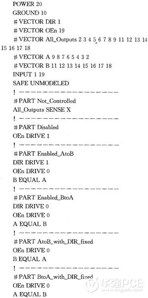 在此MODEL中,描述了器件的引腳性質(zhì)及各種狀態(tài)下的邏輯功能。MODEL被分成了若干PART,要根據(jù)電路板上器件的具體連接情況來選取相應(yīng)的PART。對(duì)于N50和N51來說,因DIR引腳接地,固定為低,我們就選取PARTBtoA_with_DIR_fixed