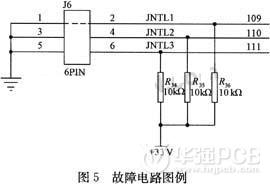 在做互連測(cè)試時(shí),建模的器件越多,故障覆蓋率就越高。本文做了一個(gè)對(duì)比實(shí)驗(yàn)。如圖5所示。N14的109、110和111這3個(gè)引腳分別與3個(gè)上拉電阻相連,同時(shí)與插針J6相連。通過跳線可以使3個(gè)引腳處于001~111這7個(gè)狀態(tài)中的某一個(gè),從而確定被測(cè)板電路響應(yīng)VXI總線中7根中斷線中的某一根。在向測(cè)試軟件輸入被測(cè)板的信息時(shí),我們默認(rèn)109~111這3個(gè)引腳正常狀態(tài)為邏輯高。那么,當(dāng)我們用跳線將J6的1、2 腳短接時(shí),就人為制造了N14的109腳與地短路的故障。