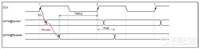 時(shí)序分析最關(guān)心的參數(shù)是信號到達(dá)接受端的最終建立時(shí)間和保持時(shí)間是否符合器件要求。這里將建立時(shí)間和保持時(shí)間分別記為Tsetup和Thold。Tflt-clk和Tflt-data分別表示時(shí)鐘信號和數(shù)據(jù)信號的飛行時(shí)間,即他們在對應(yīng)走線上的延時(shí)。Tjitter-clk和Tjitter-data分別代表時(shí)鐘信號和數(shù)據(jù)信號上的抖動時(shí)間。