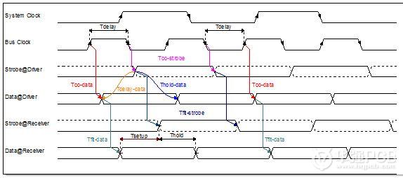 很顯然,Tco、Tflt-data 、Tflt-clk中,Tco是器件的固有參數(shù),Tflt-data 和Tflt-clk取決于對應(yīng)的PCB走線長度和走線層等。如果Tflt-data 和Tflt-clk的差過小,則導(dǎo)致數(shù)據(jù)的保持時(shí)間不足;如果過大,則會使得建立時(shí)間不足。因此,Tflt-data 和Tflt-clk的差存在上限和下限雙重限制。