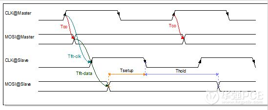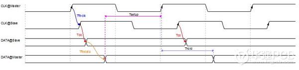 圖3是基于本模型的數(shù)據(jù)讀時(shí)序關(guān)系圖。圖中參數(shù)含義與前述相同。需要注意的是:在讀關(guān)系中,時(shí)鐘首先需要從主控端傳到從端,待從端發(fā)出的數(shù)據(jù)回到主控端后,才能由主控端對數(shù)據(jù)進(jìn)行采樣。因此,建立和保持時(shí)間的公式如下: