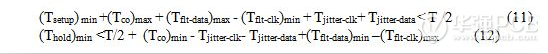 (Tsetup)min + (Tco)max + (Tflt-data)max + (Tflt-clk)min + Tjitter-clk+ Tjitter-data < T (3)