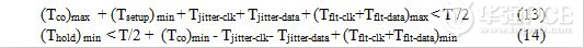 使用公式進(jìn)行計(jì)算,為簡化忽略公式(3)和公式(4)中的抖動因素Tjitter-clk和Tjitter-data,則相關(guān)公式變?yōu)椋?/p>