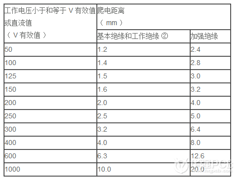 表二:爬電距離(適用于基本絕緣、工作絕緣 ② 、加強(qiáng)絕緣)