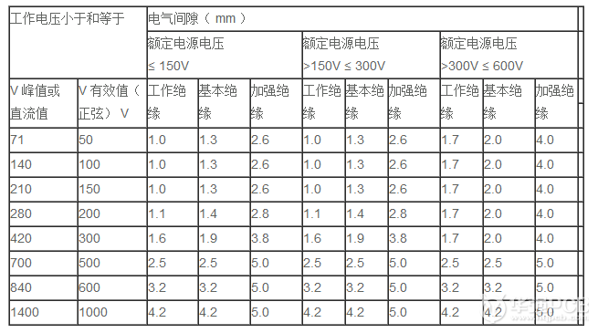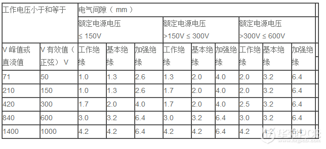 表三:電氣間隙(適用于一次電路與二次電路間、一次電路內(nèi)、輸入電路、輸入電路與其他電路)