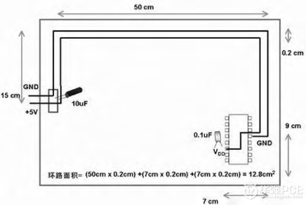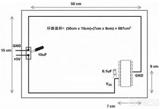 上圖通過(guò)改進(jìn)——電源與地線(xiàn)靠近走線(xiàn),減小了回路面積,降低了電磁干擾(679/12.8,約54倍)。因此,電源與地盡量應(yīng)該靠近走線(xiàn)!而信號(hào)線(xiàn)之間則應(yīng)該盡量避免并行走線(xiàn),降低信號(hào)之間的互感效應(yīng)。