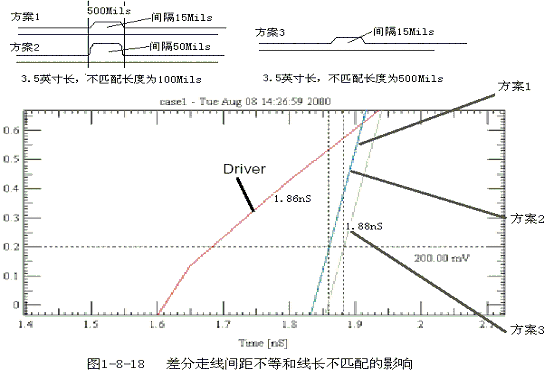 從 上面的仿真結(jié)果看來,方案1和方案2波形幾乎是重合的,也就是說,間距不等造成的影響是微乎其微的,相比較而言,線長不匹配對時序的影響要大得多(方案 3)。再從理論分析來看,間距不一致雖然會導(dǎo)致差分阻抗發(fā)生變化,但因為差分對之間的耦合本身就不顯著,所以阻抗變化范圍也是很小的,通常在10%以內(nèi), 只相當(dāng)于一個過孔造成的反射,這對信號傳輸不會造成明顯的影響。而線長一旦不匹配,除了時序上會發(fā)生偏移,還給差分信號中引入了共模的成分,降低信號的質(zhì) 量,增加了EMI。