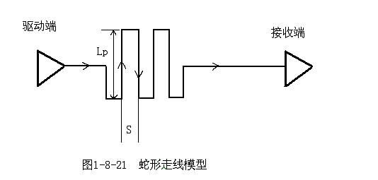 那么,蛇形線對信號傳輸有什么影響呢?走線時要注意些什么呢?其中最關(guān)鍵的兩個參數(shù)就是平行耦合長度(Lp)和耦合距離(S),如圖1-8-21所示。很明 顯,信號在蛇形走線上傳輸時,相互平行的線段之間會發(fā)生耦合,呈差模形式,S越小,Lp越大,則耦合程度也越大??赡軙?dǎo)致傳輸延時減小,以及由于串?dāng)_而 大大降低信號的質(zhì)量,其機(jī)理可以參考第三章對共模和差模串?dāng)_的分析。
