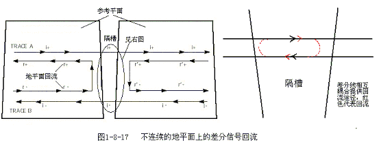 在 PCB電路設(shè)計中,一般差分走線之間的耦合較小,往往只占10~20%的耦合度,更多的還是對地的耦合,所以差分走線的主要回流路徑還是存在于地平面。當(dāng) 地平面發(fā)生不連續(xù)的時候,無參考平面的區(qū)域,差分走線之間的耦合才會提供主要的回流通路,見圖1-8-17所示。盡管參考平面的不連續(xù)對差分走線的影響沒 有對普通的單端走線來的嚴(yán)重,但還是會降低差分信號的質(zhì)量,增加EMI,要盡量避免。也有些設(shè)計人員認(rèn)為,可以去掉差分走線下方的參考平面,以抑制差分傳 輸中的部分共模信號,但從理論上看這種做法是不可取的,阻抗如何控制?不給共模信號提供地阻抗回路,勢必會造成EMI輻射,這種做法弊大于利。