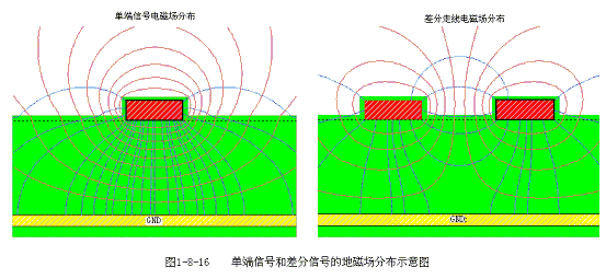 誤區(qū)一:認(rèn)為差分信號不需要地平面作為回流路徑,或者認(rèn)為差分走線彼此為對方提供回流途徑。造成這種誤區(qū)的原因是被表面現(xiàn)象迷惑,或者對高速信號傳 輸?shù)臋C(jī)理認(rèn)識還不夠深入。從圖1-8-15的接收端的結(jié)構(gòu)可以看到,晶體管Q3,Q4的發(fā)射極電流是等值,反向的,他們在接地處的電流正好相互抵消 (I1=0),因而差分電路對于類似地彈以及其它可能存在于電源和地平面上的噪音信號是不敏感的。地平面的部分回流抵消并不代表差分電路就不以參考平面作 為信號返回路徑,其實在信號回流分析上,差分走線和普通的單端走線的機(jī)理是一致的,即高頻信號總是沿著電感最小的回路進(jìn)行回流,最大的區(qū)別在于差分線除了 有對地的耦合之外,還存在相互之間的耦合,哪一種耦合強(qiáng),那一種就成為主要的回流通路,圖1-8-16是單端信號和差分信號的地磁場分布示意圖。