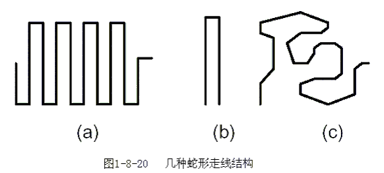 5. 可以經(jīng)常采用任意角度的蛇形走線,如圖1-8-20中的C結(jié)構(gòu),能有效的減少相互間的耦合。