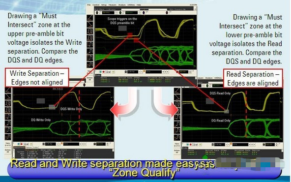 使用InfiniiScan是一種較好的方法,它使用畫圖式的圖形觸發(fā)分離出讀和寫,然后再累積成眼圖,可以累積大量的數(shù)據(jù),然后再測試建立時間、保持時間和其他參數(shù),分離方法如下圖:
