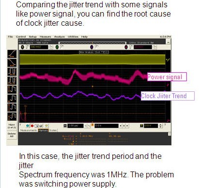 對于系統(tǒng),出現(xiàn)時鐘問題時,很多時候與供電電源有關(guān)(約占80%以上),這時候可以使用抖動分析軟件抖動趨勢圖方法進(jìn)行問題根源跟蹤:因為抖動趨勢圖和其他通道信號可以同時顯示在示波器的屏幕上,當(dāng)發(fā)現(xiàn)抖動趨勢圖和電源信號同步變化時,基本可以確定抖動問題是來自這個電源。