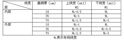 導線橫截面:以前我一直以為導線的橫截面是一個矩形,但實際上卻是一個梯形。以TOP層為例,當銅箔厚度為1OZ時,梯形的上底邊比下底邊短1MIL。比如線寬5MIL,那么其上底邊約4MIL,下底邊5MIL。上下底邊的差異和銅厚有關(guān),下表是不同情況下梯形上下底的關(guān)系。