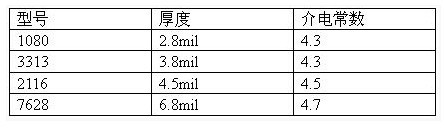 介電常數(shù):半固化片的介電常數(shù)與厚度有關(guān),下表為不同型號的半固化片厚度和介電常數(shù)參數(shù):