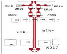 首先對ADS5463的時鐘線進行分析。為了使ADS5463有一個較高的信噪比,AD9517的輸出時鐘設為LVPECL電平。驗證板上由AD9517到ADS5463的時鐘線布局如圖2所示。