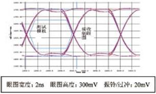 圖3中六邊形的部分和矩形的邊框為眼圖的測試模板,其他部分為接收端的眼圖。對于LVPECL電平而言,噪聲容限為200mV。輸出電壓典型值為800mV,最大閾值電壓為300mV。ADS5463的上升時間和下降時間的典型值為500ps(注:這里的上升時間和下降時間指的是上升沿和下降的20%到80%這一段長度所占用的時間)。根據(jù)這些參數(shù)我們設定用于眼圖測試的模板。用于眼圖測試的模板是圖3中的六邊形。