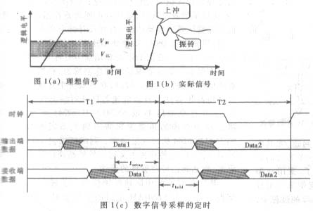 信號完整性SI(Signal Integrity)涉及傳輸線上的信號質量及信號定時的準確性。在數(shù)字系統(tǒng)中對于邏輯1和0,總有其對應的參考電壓,正如圖1(a)中所示:高于ViH的電平是邏輯1,而低于ViL的電平視為邏輯0,圖中陰影區(qū)域則可視為不確定狀態(tài)。而由圖1(b)可知,實際信號總是存在上沖、下沖和振鈴,其振蕩電平將很有可能落入陰影部分的不確定區(qū)。信號的傳輸延遲會直接導致不準確的定時,如果定時不夠恰當,則很有可能得到不準確的邏輯。例如信號傳輸延遲太大,則很有可能在時鐘的上升沿或下降沿處采不到準確的邏輯。一般的數(shù)字芯片都要求數(shù)據(jù)必須在時鐘觸發(fā)沿的tsetup前即要穩(wěn)定,才能保證邏輯的定時準確(見圖1(c))。對于一個實際的高速數(shù)字系統(tǒng),信號由于受到電磁干擾等因素的影響,波形可能會比我們想象中的更加糟糕,因而對于tsetup的要求也更加苛刻,這時,信號完整性是硬件系統(tǒng)設計中的一個至關重要的環(huán)節(jié),必須加以認真對待。