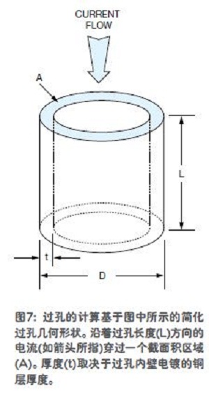 過(guò)孔電阻的計(jì)算基于圖7所示的簡(jiǎn)化過(guò)孔幾何形狀。沿著過(guò)孔長(zhǎng)度(L)方向的電流(如箭頭所指)穿過(guò)一個(gè)截面積區(qū)域(A)。厚度(t)取決于過(guò)孔內(nèi)壁電鍍的銅層厚度。