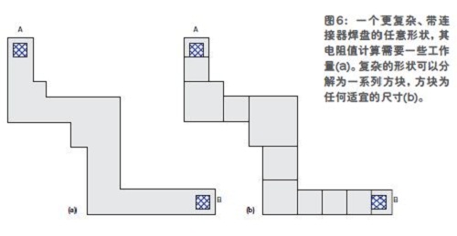 采用前述的相同技術(shù),我們可把復(fù)雜形狀分解為一系列方塊,如圖6b所示。這些方塊可以是任何適宜的尺寸,可用不同尺寸的方塊來(lái)填充整個(gè)感興趣的區(qū)域。只要我們有一個(gè)正方塊,并知道銅走線的重量,就能知道電阻值。