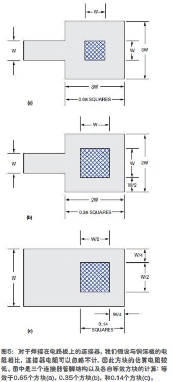 然后,我們要加上兩個(gè)有連接器的方塊,每個(gè)按0.14個(gè)方塊計(jì)算(圖5c)。因此,兩個(gè)連接器算0.28個(gè)方塊(2×0.14)。對(duì)于1oz.銅箔,這增加了0.14mΩ的電阻(0.28×0.5mΩ=0.14mΩ)。