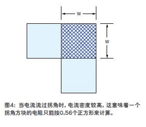 當(dāng)電流流過(guò)拐角時(shí),電流密度較高,這意味著一個(gè)拐角方塊的電阻只能按0.56個(gè)正方形來(lái)計(jì)算。