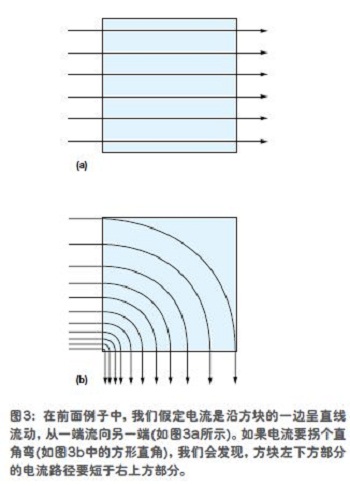 首先要知道,在前面的例子中,我們假定電流是沿方塊的一邊呈直線流動(dòng),從一端流向另一端(如圖3a所示)。然而,如果電流要拐個(gè)直角彎(如圖3b中的方形直角),那情況就有些不同了。