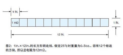 我們舉一個(gè)簡(jiǎn)單的例子。圖2是一條長(zhǎng)方形的銅走線,在25℃時(shí)其重量約為0.5oz.,走線寬度為1英寸,長(zhǎng)度為12英寸。我們可以將走線分解成一系列方塊,每個(gè)方塊邊長(zhǎng)都是1英寸。這樣,總共就有12個(gè)方塊。按照表2,每個(gè)0.5oz.重的銅箔方塊的電阻為1mΩ,現(xiàn)在共有12個(gè)方塊,因此走線的總電阻為12mΩ。