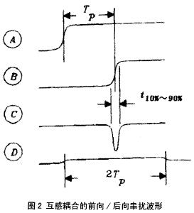 如圖2所示,往C方向的前向干擾能量,是和入射電壓及每個(gè)互感分量Lm成正比,因?yàn)樗星跋蚋蓴_能量幾乎同時(shí)抵達(dá)C點(diǎn),所以前向干擾能量與兩傳輸線的互感總量成正比,傳輸線平行的長度越長,所產(chǎn)生的互感總量就越大,前向干擾能量也隨即增加;然而往D點(diǎn)的后向干擾能量與往C點(diǎn)的前向干擾能量不同的是,雖然兩者耦合的總區(qū)域是一樣的,但每個(gè)互感變壓器所感應(yīng)的干擾分量是依序到達(dá)D,后向干擾能量的有效時(shí)間長達(dá)2Tp(Tp為傳播延時(shí)),隨著線路平行長度的延長 (即互感增加),后向串?dāng)_的幅度大小是不會(huì)變化的,而持續(xù)時(shí)間會(huì)增加。