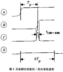分布式耦合電容的耦合機(jī)制和分布式電感耦合相類似,區(qū)別在于耦合的極性。如圖3所示,互容耦合的前向和后向干擾能量的極性都是正的。