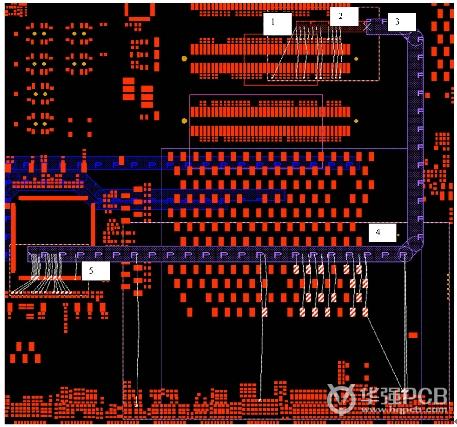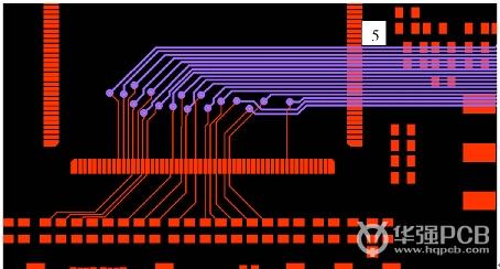 如圖5中的細(xì)節(jié)“4”所示那樣,由于需要使用過(guò)孔適應(yīng)單比特T型交接點(diǎn),拓?fù)渎窂阶兇罅?。這里規(guī)劃又一次體現(xiàn)了設(shè)計(jì)人員對(duì)這些單比特T型交換點(diǎn)的意圖,從第3層布線到第4層。另外,第3層上的線跡非常緊密,雖然在插入過(guò)孔的地方有些膨大,但經(jīng)過(guò)過(guò)孔后很快又緊密起來(lái)。