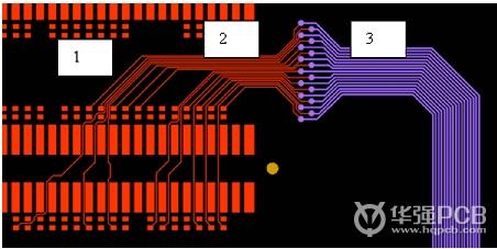 從左上角開始,從元件引腳出來(lái)的所有連線都遵從設(shè)計(jì)人員表達(dá)的意圖而位于第1層上,并壓縮成緊密的總線結(jié)構(gòu),如圖4中的細(xì)節(jié)“1”和“2”。 第1層和第3層之間的轉(zhuǎn)換發(fā)生在細(xì)節(jié)“3”處,并采用了很占用空間的過(guò)孔形式。需要重申的是,這里考慮了阻抗因素,因此走線更寬,間距更大,如實(shí)際寬度路徑所表示的那樣。