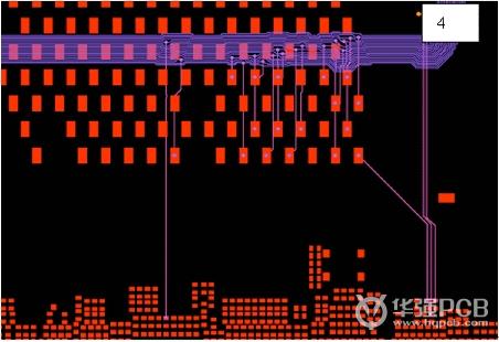 當(dāng)拓?fù)渎窂窖刂鴪D3中間靠右部分走到細(xì)節(jié)“4”處時(shí),需要從拓?fù)渎窂竭B接和各個(gè)元件引腳處引出許多單比特T型交接點(diǎn)。PCB設(shè)計(jì)人員的選擇是保持大多數(shù)連接流在第3層上,并穿透到其它層用于連接元件引腳。因此他們畫了一個(gè)拓?fù)鋮^(qū)用于指示從主線束到第4層(粉色)的連接,并使這些單比特T型接點(diǎn)連到第2層,然后使用其它過(guò)孔連接到器件引腳。